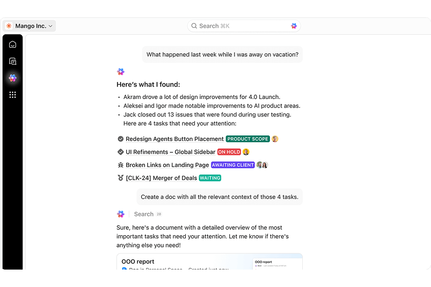- Audit détaillé de l’environnement ClickUp : analyse des espaces, statuts, assignations, dashboards et automatisations.